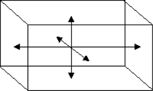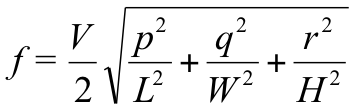 Extending this principle, if you wanted to calculate the second order tangential mode that resonates between the two long walls, and the floor and the ceiling, we would be interested in the width and height, but not along the length. So p would be set to 0, and q and r would be set to 2.