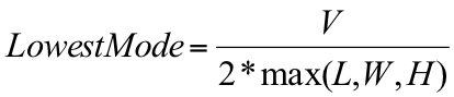 The lowest mode will always be a first order axial mode and will occur between the pair of surfaces that are farthest apart; so one of the values p, q, and r will be set to 1 and the remaining two values will be set to 0. Which ones are set to 0 depends on which is the longest dimension. Equation 12 can now be simplified to what you see in equation 13: