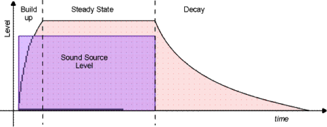 Another property of a steady state sound field is that its volume level is always slightly greater than the volume level being pumped into the room by the speakers. The reason for this is that once a reverberant field has been achieved, the volume level will be the sum of the instantaneous energy being added by the speakers, and the energy from the echo of the earlier sounds.