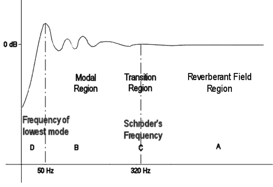 At the bottom end of the scale is region D. No resonance can occur below this cut-off frequency because the room is not large enough to accommodate half a wavelength. The boundary of region D is well defined.